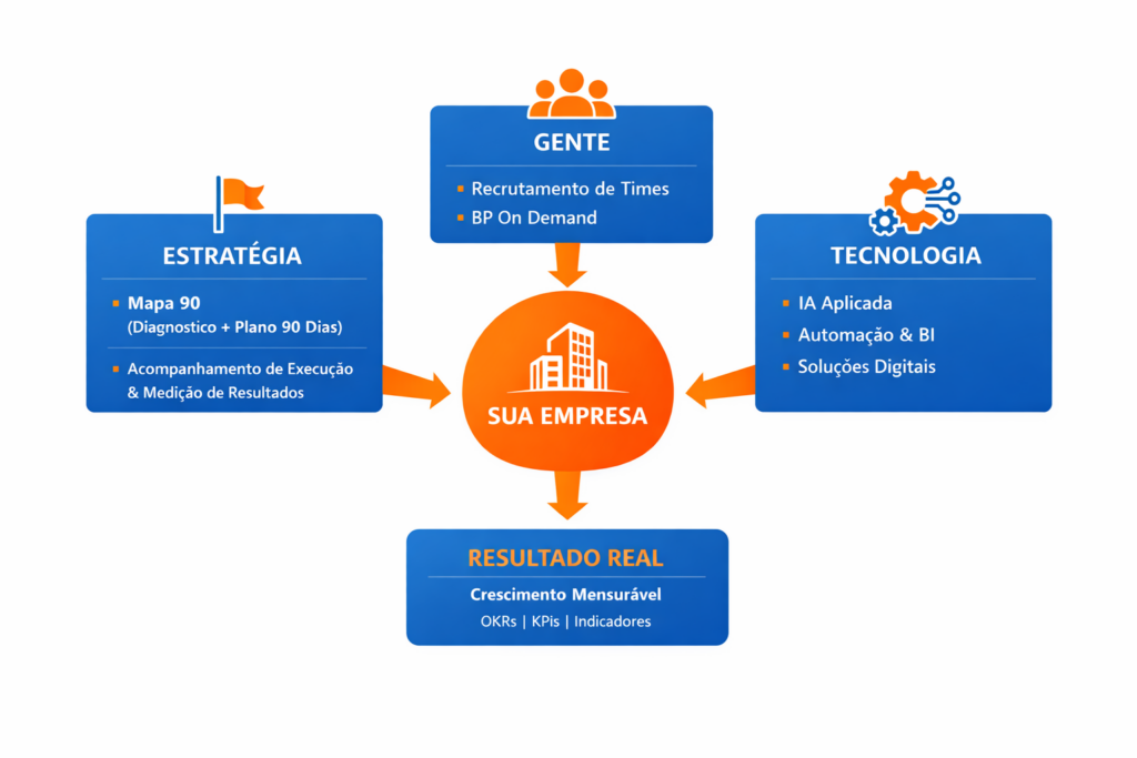 Alinhamos direção estratégica, recrutamento, engajamento de equipes e soluções digitais para impactar seus indicadores em 90 dias